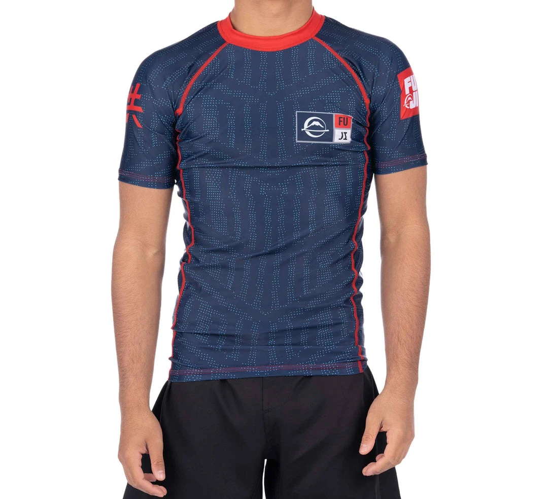 An amazing new look launched for grapplers worldwide! The Team FUJI Rashguard sets the precedent of going far and wide in terms of training and competition. Designed with a bold red collar and contrast stitching with strong strips of textured blue running across the chest, back and sleeve. As well as bold designs on the sleeves. This rashguard moves forward, will you?